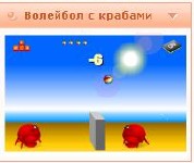 [/c]Простой, но весьма занимательный и расслаб*яющий волейбол с крабами... Перебрасывайте мяч через сетку, при каждом попадании мяча на землю снимаются очки.