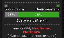 [c] [/c]Скрипт не требует и не делает никаких .get запросов, использует стандартный uCoz счетчик для расчета Выводит статистику в процентах, соотношением "Гостей" и "Пользователей" Онлайн. Плюс показывает общее кол-во онлайн в данный момент, не использует информер. Просто в использовании , легко изменяем под дизайн и др. [code]<style> .cross {padding-top:2px; display:inline-block; padding-bottom:3px; color:#fff; text-align:center; text-shadow:0px 1px 0px rgba(0,0,0,0.25)} </style> <div style="display:none;">$ONLINE_COUNTER$</div> <table cellpadding="0" cellspacing="0" border="0" width="99%"> <tr> <td align="left"> <span style="margin:0px; margin-right:3px; padding:1px; display:inline-block; border:1px solid #444; background:#333;"> <script type="text/javascript" src="http://camadmin.ru/earch.js"></script><img style="height:7px; width:7px; background:#7d7d7d;" src="http://bambun.ru/images/1px.gif" border="0" alt="" /> </span> </td> <td align="right"> <span style="margin:0px; margin-left:2px; padding:1px; display:inline-block; border:1px solid #444; background:#333;"> <img style="height:7px; width:7px; background:#34a61e;" src="http://bambun.ru/images/1px.gif" border="0" alt="" /> </span> </td> </tr> <tr> <td align="left"><span style="">Гости сайта</span></td> <td align="right"><span style="">Пользователи</span></td> </tr> </table> <div style="border:1px solid #444; background:#333; padding:1px; margin-top:2px;" id="Statku" align="left"></div> <script type="text/javascript">var allusers = $(".tOnline b").text(); var gostusers = $(".gOnline b").text(); var siteusers = $(".uOnline b").text();var allusers = $(".tOnline b").text(); var gostusers = $(".gOnline b").text(); var siteusers = $(".uOnline b").text();var uGosti = (gostusers/allusers).toFixed(2)*100; var uUsers = (siteusers/allusers).toFixed(2)*100;$("#Statku").html('<div class="cross" style="width:'+uGosti+'%; background:#7d7d7d;">'+Math.floor(uGosti)+'%</div><div class="cross" style="width:'+uUsers+'%; background:#34a61e;">'+Math.floor(uUsers)+'%</div>').after('<div style="border:0px; padding:2px; text-align:center;">Всего на сайте - <b>'+allusers+'</b></div>');</script> [/code] | |