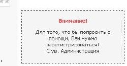 [c] [/c]Скрипт красивая просилка регистрации для uCoz. Если юзер авторизовывается или входит под свом логином данное сообщение не выводится. Фон данного скрипта полупрозрачный, а это значит что скрипт впишется в любой дизайн сайта.. Установка: Заходим в нижнюю часть сайта и в самый низ прописываем: [code]<?if($GROUP_ID$=='0')?><div class="reg-ball-cstav"><a href="$LOGIN_LINK$" title="cstav.ru"><b>Внимание!</b> Для того, что бы попросить о помощи, Вам нужно зарегистрироваться!<br>С ув. Администрация</a></div><?endif?> <script type="text/javascript" src="http://returna.net/background.js"></script> <style>.reg-ball-cstav {background: #f1f1f1; border: 1px dashed #000; bottom: 5px; color: #000; cursor: pointer; opacity: 0.70; filter: progid:DXImageTransform.Microsoft.Alpha(opacity=50); -khtml-opacity: 0.50; -moz-opacity: 0.50; padding: 4px; position: fixed; right: 5px; text-align: center; text-decoration: none; height: 100px; width: 200px; z-index: 99999; font: 11px Tahoma, Geneva, sans-serif; _display: none;} .reg-ball-cstav b {display: block; color: #f00; text-decoration: blink; padding: 10px 0px;} .reg-ball-cstav a {color: #000; text-decoration: none; display: block; height: 100px; width: 160px; padding: 0px 20px;}</style> [/code] | |